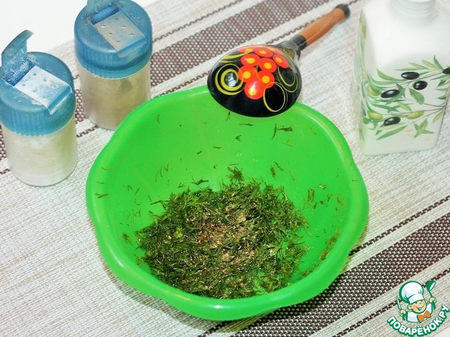 11. Мелко порезать зелень, посолить и перетереть пальцами или пестиком до выделения сока. Добавить прессованный зубчик чеснока. Выложить зелень в кефирную смесь и перемешать.