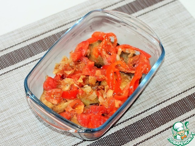 12. Выложить баклажаны 1/2 часть в форму, сверху кладем 1/2 часть зажарки.
