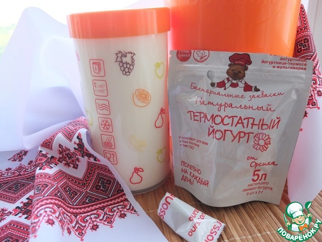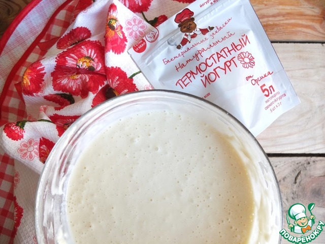 Добавляем к молоку 1 пакетик бактериальной закваски OURSSON "Термостатный йогурт" от Орсика, тщательно перемешиваем. Переливаем молоко в колбу с крышкой, плотно закрываем крышку и ставим в йогуртницу-термос, наполненную кипятком. Плотно закрываем крышку и ставим в теплое место на 6-12 часов. Я оставила на кухне, на столе на ночь. -