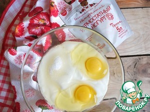 Для блинов я использовала 500 мл йогурта. К йогурту добавляем яйца, соль, сахар. Перемешиваем, я слегка взбивала венчиком.