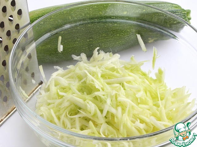 Добавим натертые кабачки, предварительно слив отделившуюся жидкость. Тщательно перемешаем массу ложкой. -