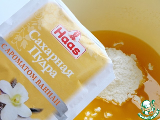 И сахарную пудру с ароматом ванили. При желании, для придания более насыщенного аромата, можно дополнительно добавить половину чайной ложки ванили.