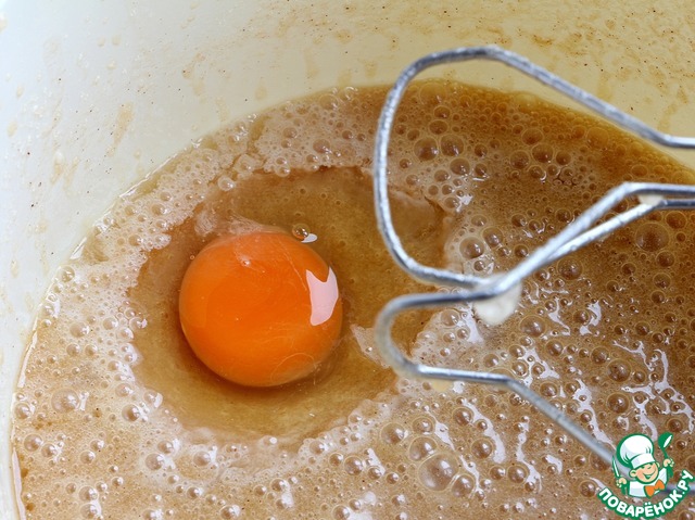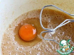 Аккуратно добавим сухие компоненты в жидкие составляющие, перемешаем ложкой до соединения, а затем взобьем миксером до получения гладкой массы.