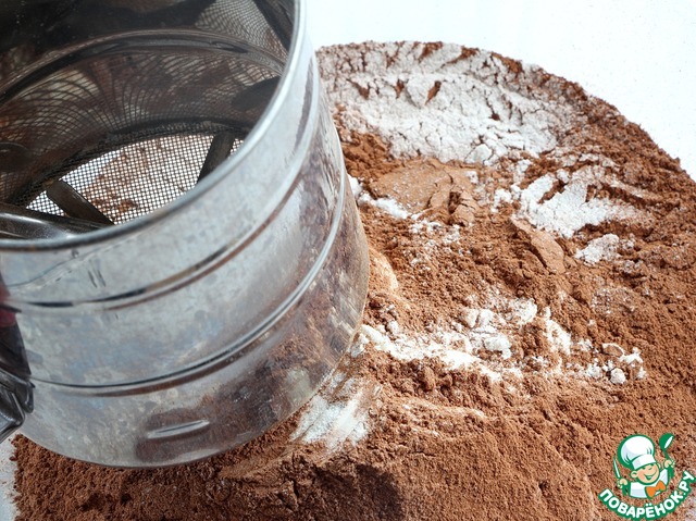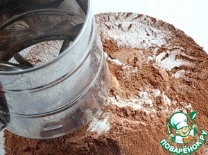 В отдельную емкость смешаем сухие компоненты. Для этого просейте муку, предварительно добавив в неё соду и разрыхлитель. Добавим молотую гвоздику и какао.
