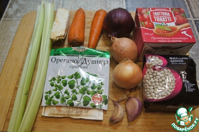 Фасоль замочить на ночь (можно взять банку консервированной белой фасоли (400 г), слив предварительно жидкость и промыв холодной водой).