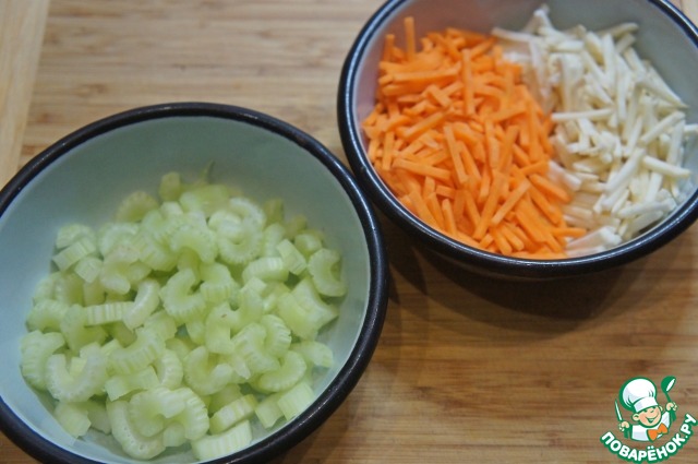 Тем временем подготовить овощи. Морковь и сельдерей нашинковать тонкой соломкой, стебли сельдерея нарезать ломтиками.