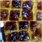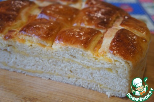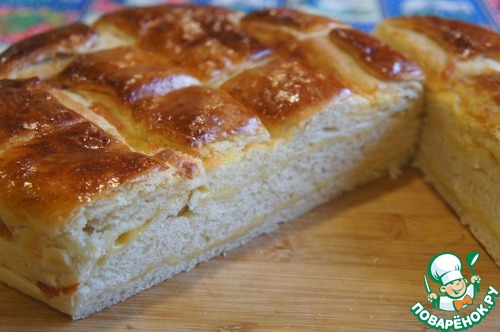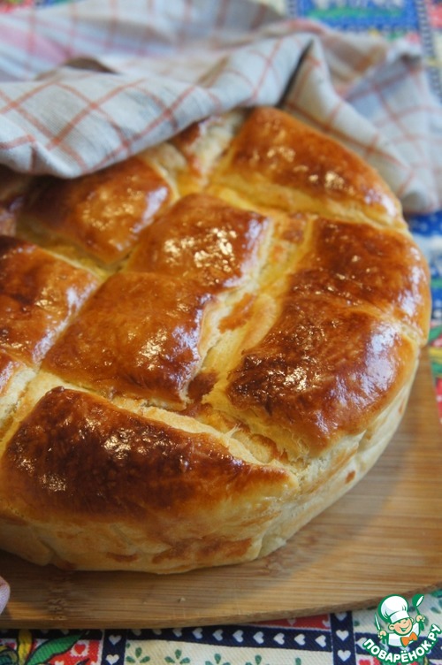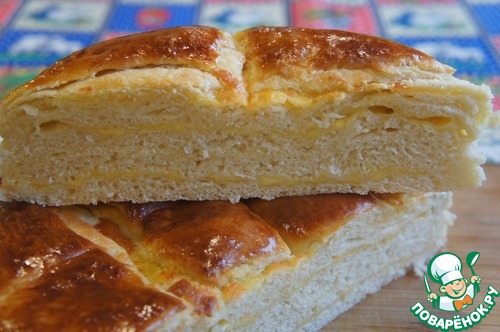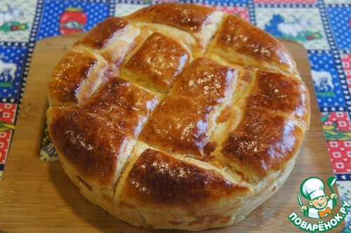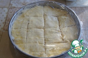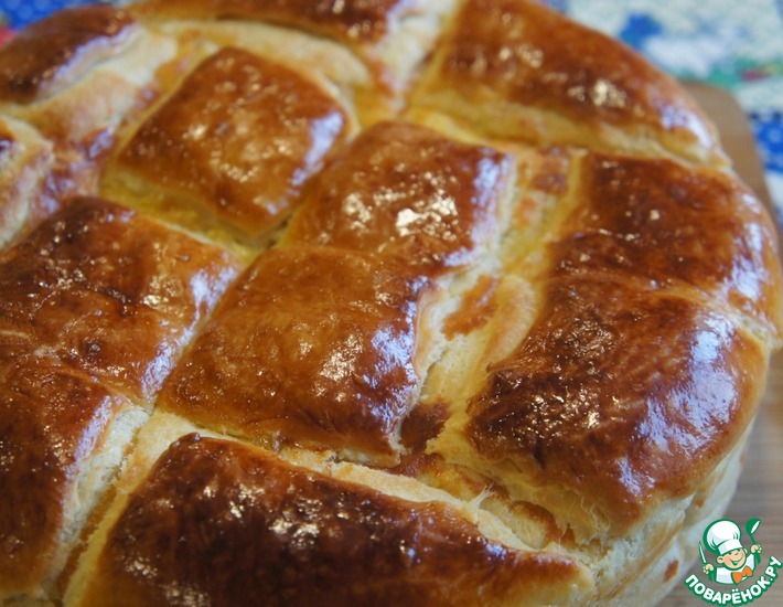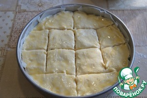 Шестая лепешка, масло, седьмая лепешка. Последнюю лепешку смазать не маслом, а яичным желтком. Затем нарезать пирог на квадраты, не разделяя их. -