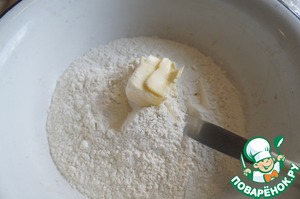 В муку добавить 50 г масла и растереть руками в крошку.