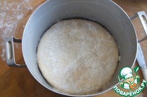 Уложить тесто в большую кастрюлю, припорошить мукой и поставить тесто в теплое место.