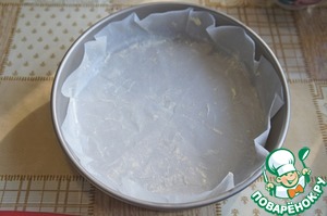 Форму для пирога (20 х 25 см или круглую диаметром около 23-24 см) застелить пекарской бумагой, слегка смазанной маслом.