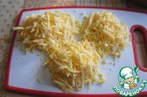 Сыр натереть на крупной терке и разделить на три части.
