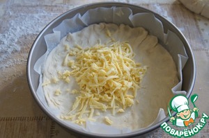 Тонко раскатать часть теста и выложить его в смазанную маслом форму. Щедро смазать лепешку растопленным сливочным маслом и равномерно присыпать одной частью тертого сыра.
