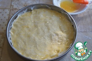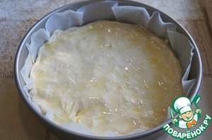 Потом раскатать еще одну часть теста. Положить ее сверху. В этот раз только смазать растопленным сливочным маслом.