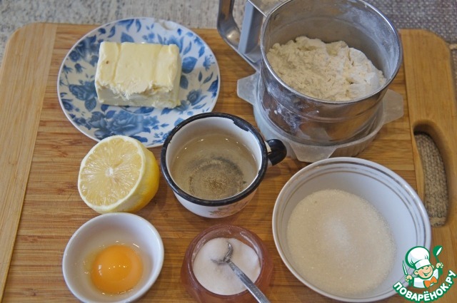 "Муку просеять. В комбайн положить муку, сахар и желток, включить режим пульсации на несколько секунд. Добавить масло, нарезанное маленькими кусочками, включить на несколько секунд. Добавить желток – еще несколько секунд. Влить воду и сок в два приема (вся жидкость может и не понадобиться). Тесто должно выглядеть как чуть влажная жирная крошка. Пересыпать тесто на сухую чистую поверхность и быстро слепить из него диск. Тесто не разминать и не месить! Завернуть диск в пластиковую пленку и убрать в холодильник на полчаса. Форму застелить пекарской бумагой, выложить тесто, подравнять края и наколоть вилкой. Охладить в холодильнике полчаса."