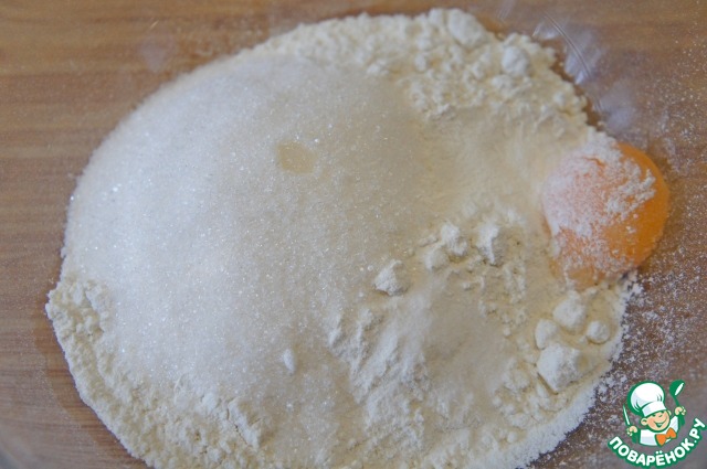 Муку просеять. Добавить сахар и желток. Перемешать.