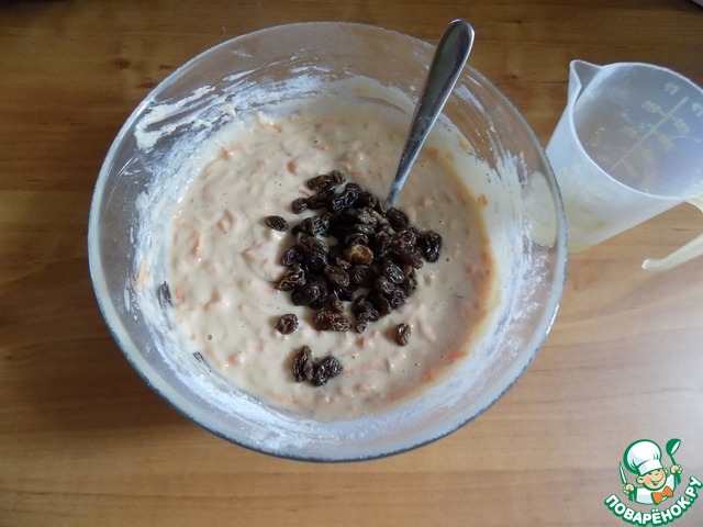 Изюм нам нужно запарить. Берём посуду, где будем замешивать тесто и наливаем туда ряженку. гасим в ней соду. Добавляем сахар, яйца и тщательно соединяем до растворения сахара. Выкладываем манку, опять перемешиваем и добавляем в тесто натёртую морковь. Морковь лучше в пирог брать сладких сортов. Перемешиваем и просеиваем муку.