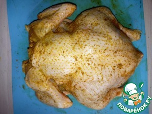 • Натираем цыплёнка сначала карри, затем хмели-сунели, затем смесью перцев. Приправы не жалеем, натираем и внутри и снаружи. После поливаем цыплёнка лимонным соком.