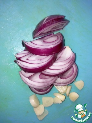Половинку луковицы режем полукольцами, чеснок крупно, помидор кружочками.