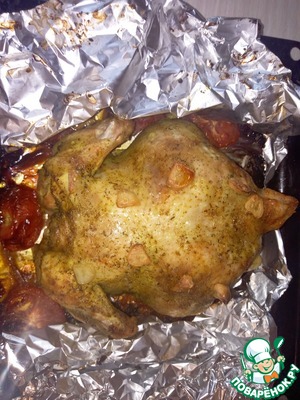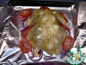 • Укладываем цыплёнка на фольгу, предварительно смазав её маслом ( но смазываем немного, так как курица и так даст сок). Лук, чеснок, и помидор укладываем так как показано на фото.