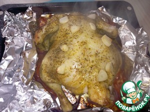 • Закрываем цыплёнка фольгой и ставим в разогретую до 220 градусов духовку на 60 минут.