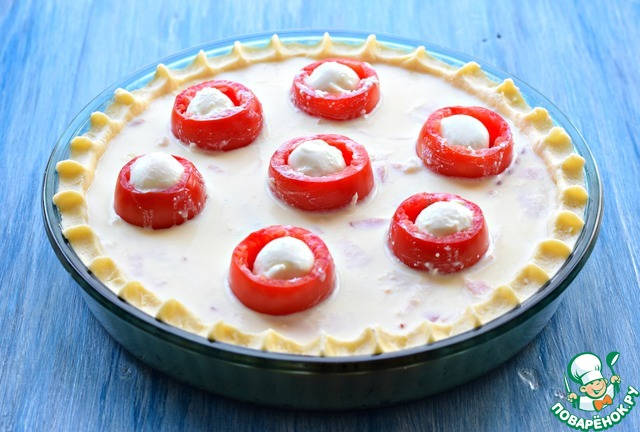 Аккуратно вылить творожную начинку в форму с тестом. (в помидоры стараться не попадать)