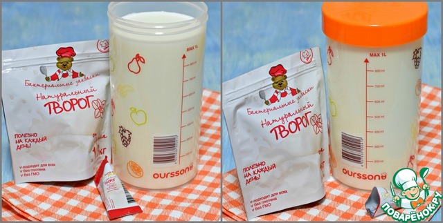 Емкость для приготовления творога простерилизовать. Влить в нее пастеризованное молоко комнатной температуры. (я взяла молоко 2,7% жирности) В молоко всыпать закваску для творога, тщательно перемешать чистой сухой ложкой до полного растворения закваски. Емкость закрыть крышкой. Поставить в термос-йогуртницу на 6-10 часов для сквашивания продукта.