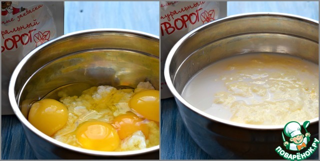 В творог вбить яйца, влить молоко, хорошо перемешать массу. -