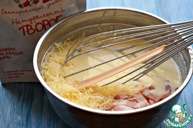 Добавить нарезанный небольшими кусочками бекон и натертый на мелкой терке сыр. (50 г) Перемешать.