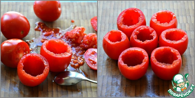 У помидоров срезать "шапочку", чайной ложкой удалить мякоть. (томатную мякоть и срезанные крышечки ни в коем случае не выбрасывайте! Их можно заморозить и позже использовать для приготовления первых, вторых блюд или соусов)
