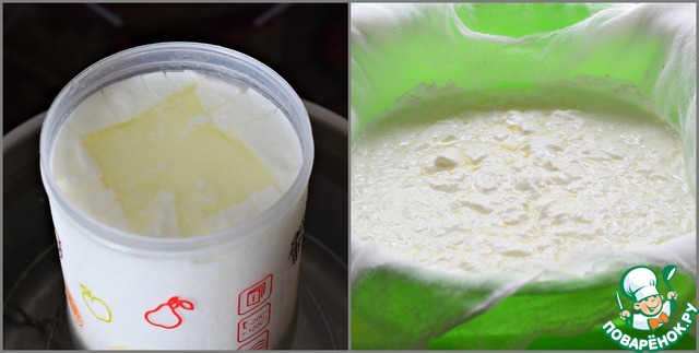 Затем откинуть массу на сито (или дуршлаг), простеленное марлей в 2-3 слоя. Для того, чтоб творог получился более сухой можно положить его под пресс на 3-4 часа. (на ночь) -