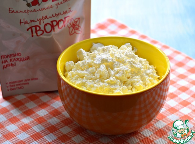 Из одного литра молока и одного пакетика закваски у меня вышло 200 г творога. Для приготовления предлагаемого киша понадобится всего 400 г творога, поэтому используется 2 литра молока и два пакетика закваски. -
