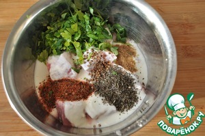 Добавляем соль, сухую аджику, хмели-сунели, сухую мяту, зёрна кориандра и рубленную зелень петрушки.