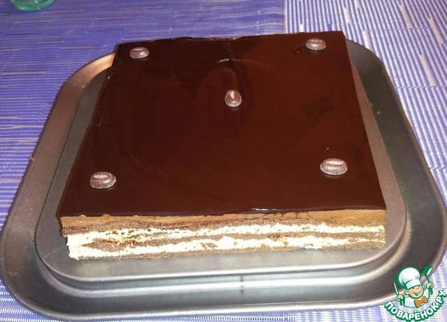 Торт собираем в форме. Коржи пропитываем кофейным сиропом и собираем торт. Корж-сироп-белый ганаш-корж-сироп-белый ганаш-корж -сироп-шоколадный крем, выравниваем и оставляем в холодильнике примерно на 2 часа