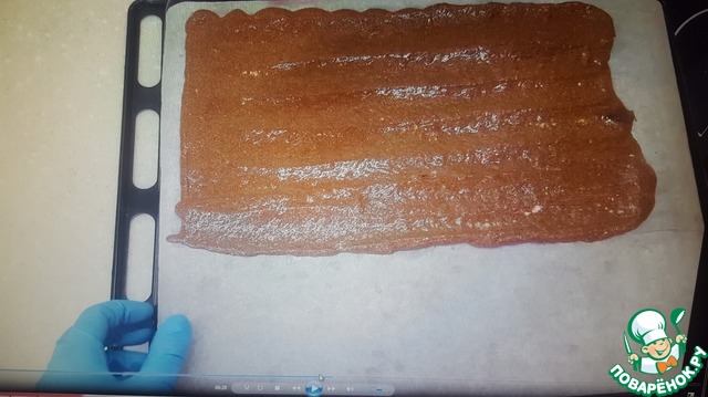 Тесто распределяем тонким слоем по пергаменту. У меня 3 квадрата по 18 см. выпекала одновременно при температуре 180 градусов примерно 12 минут.