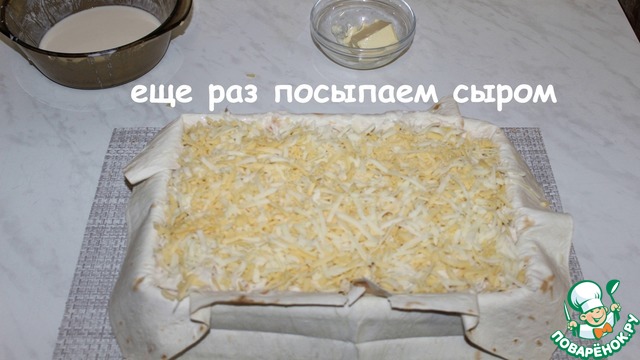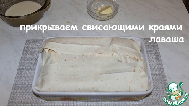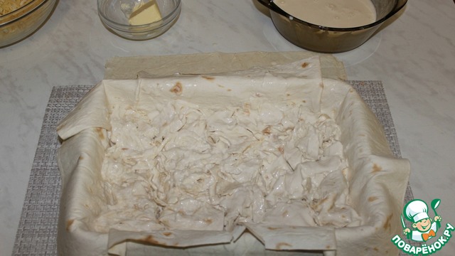 Каждый кусочек лаваша немного отжимаем и выкладываем на дно формы.