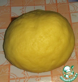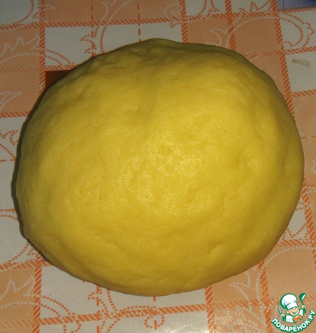 Замешиваем тесто, скатываем в шар, остужаем минут 15-20. Затем кладем тесто в миску, накрываем пищевой пленкой и ставим в холодильник на пол часа.