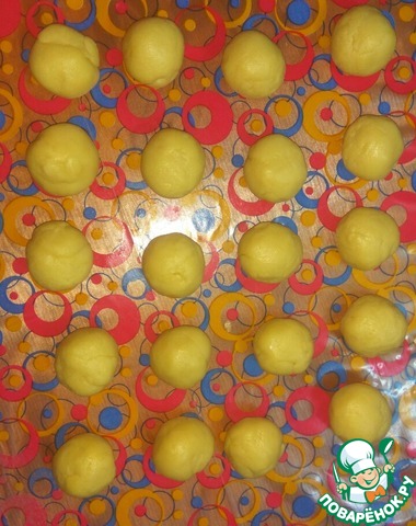 Достаем из холодильника тесто. Делим на 20 кусочков. Катаем шарики из теста.