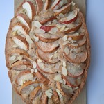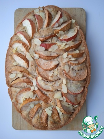 Тесто выложить в форму (у меня 22х22см) и разровнять. Вдавить дольки яблок (мои яблоки были небольшие, я делила каждое на 8 долек и ушло у меня 600 грамм неочищенных яблок) и посыпать миндальными лепестками. Выпекать при 180 градусах около часа.