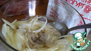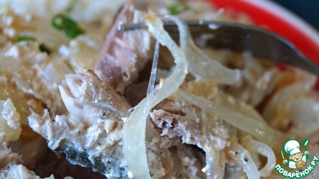 У меня лук оказался сырым, хоть и долго запекала в духовке. А вот рыбка получилась вкусная, но, к сожалению, в разогретом виде немного с запахом.