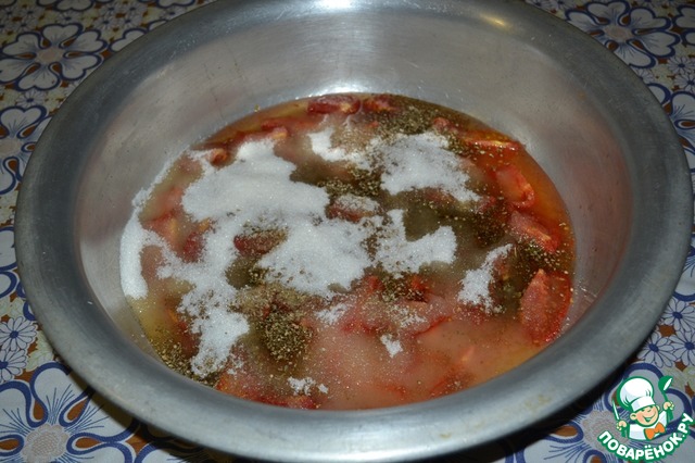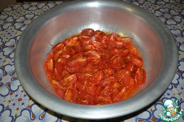 Изначально в рецепте было заявлено на 1 кг томатов 500 г сахара, но я решила, что это будет слишком приторно и снизила количество сахара до 300 г. -