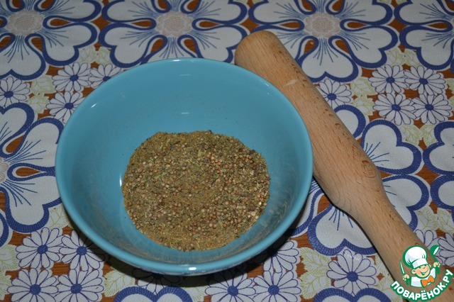 В глубокую чашу выложить все сыпучие специи, хорошо истолочь ступкой или толкушкой.