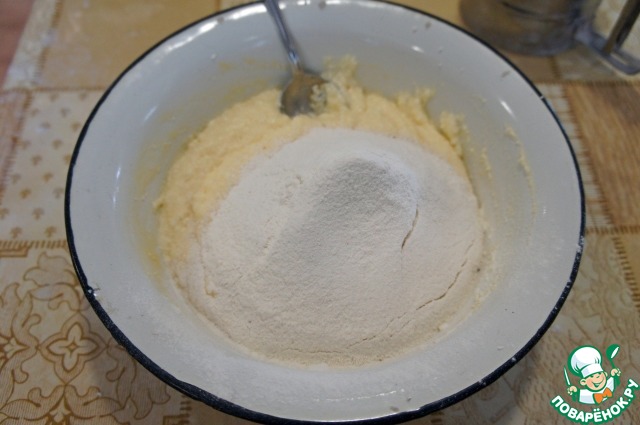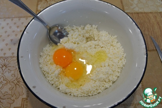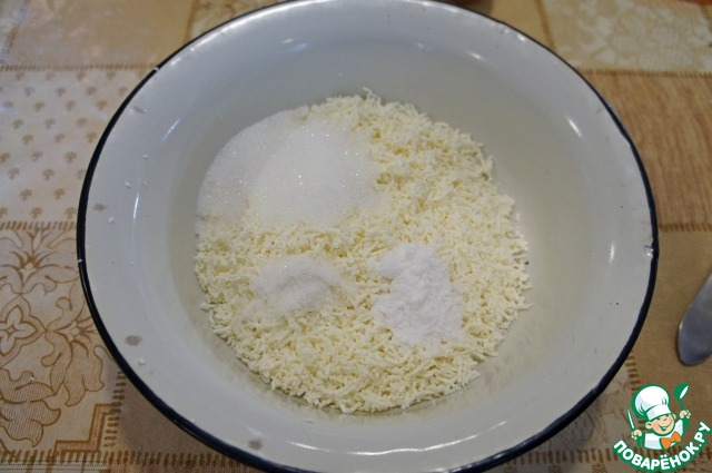 Творог протереть сквозь сито, добавить сахар, соль и соду. Перемешать.