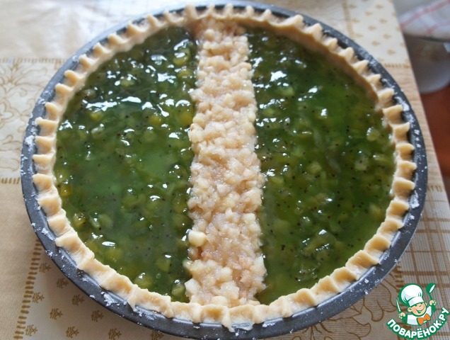 На тесто выложить начинку – любые фрукты, густое варенье или джем (у меня был джем из киви с крыжовником от фирмы "Махеев", две упаковки, и немного яблочной начинки).