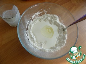 Делаем углубление в муке и наливаем кефир, добавляем масло подсолнечное. Замешиваем тесто. Я сначала вилкой собираю муку по часовой стрелке, а затем тесто делаю руками.
