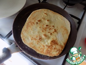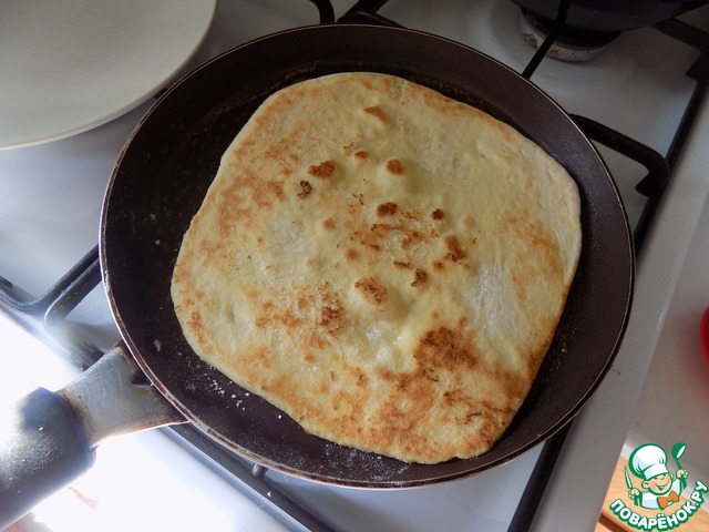 Выкладываем лепёшку, жарим с одной стороны 1 минуту примерно, не убавляя огонь.