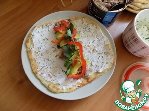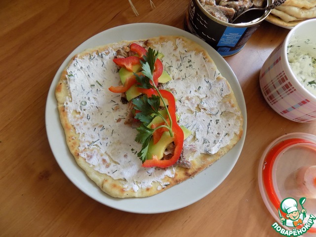 Делаем сырную намазку. Смешиваем творожный сыр+мелко порубленный укроп+соль и перец свежемолотый по вкусу. Обмазываем лепёшку с одной стороны намазкой. Авокадо чистим и режем тонко, сбрызнув лимонным или лаймовым соком. На намазку выкладываем тунец или сайру разобранную на волокна. Кладём по центру лепёшки. На рыбу-авокадо и тонко резанный болгарский перец, веточку петрушки.