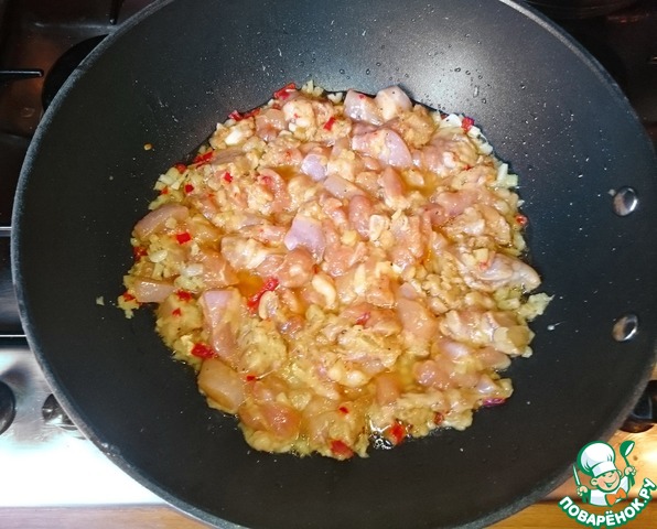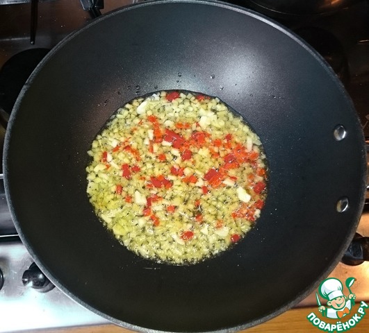 Ставим вок или глубокую сковороду на большой огонь, добавляем масло, даем ему разогреться и обжариваем чеснок, перец и имбирь. (До углей доводить не стоит)