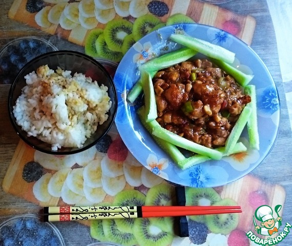 Подаем с отварным рисом, немного сбрызнутым соевым соусом и свежим огурцом. Т. к. курочка получается довольно острой, то свежий огурчик будет очень кстати.