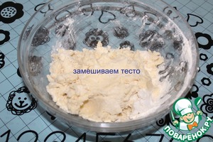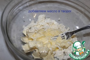В муку добавляем разрыхлитель и хорошо перемешиваем. В творожно-масляную смесь добавляем муку.