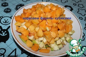 Пока тесто в холодильнике, готовим начинку. Нарезаем фрукты кубиками. У меня абрикосы и яблоки.